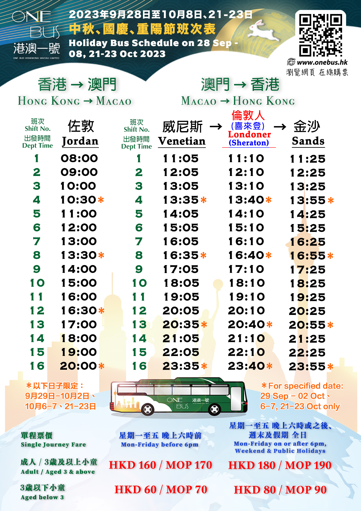 2. Where are the boarding points in Hong Kong and Macau?In Hong Kong, passengers should be on board in Jordan and Wan Chai. In Macau, there are three boarding points - Sands Macao, The Venetian and The Londoner (Londoner Grand). Please have a look on the sequence of pick up and drop off points as shown in the Route and Timetable categories.